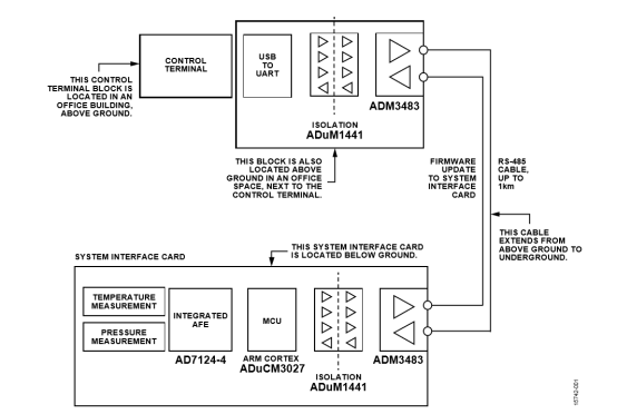 而在電池供電系統(tǒng)、一些對(duì)續(xù)航敏感地應(yīng)用(如井下、采礦)以及在4mA至20mA環(huán)路中工作的過程控制系統(tǒng)中,往往對(duì)低功耗工作模式具有較高需求。ADI公司的微功耗數(shù)字隔離器 ADuM1441在關(guān)斷模式下的靜態(tài)功耗低于23μA。ADI公司提供的ADM3483 3.3V、250 kbps RS-485收發(fā)器的靜態(tài)功耗也極低,關(guān)斷模式下通常僅2nA。圖1所示為適合井下應(yīng)用穩(wěn)定可靠的低功耗隔離式RS-485 解決方案。ADM3483和ADuM1441共用可提供一條通往遠(yuǎn)程地下測(cè)量節(jié)點(diǎn)的可靠低功耗鏈路。系統(tǒng)接口卡包括 ARM® Cortex® 微控制器單元 (MCU)、ADuCM3027和集成 模擬前端(AFE)AD7124-4,用于遠(yuǎn)程溫度和壓力測(cè)量。系統(tǒng)接口卡的固件更新通過遠(yuǎn)距離RS-485電纜提供,更新后能夠在最長(zhǎng)1km的遠(yuǎn)距離內(nèi)實(shí)現(xiàn)低數(shù)據(jù)速率傳輸(例如,9.6 kbps)。